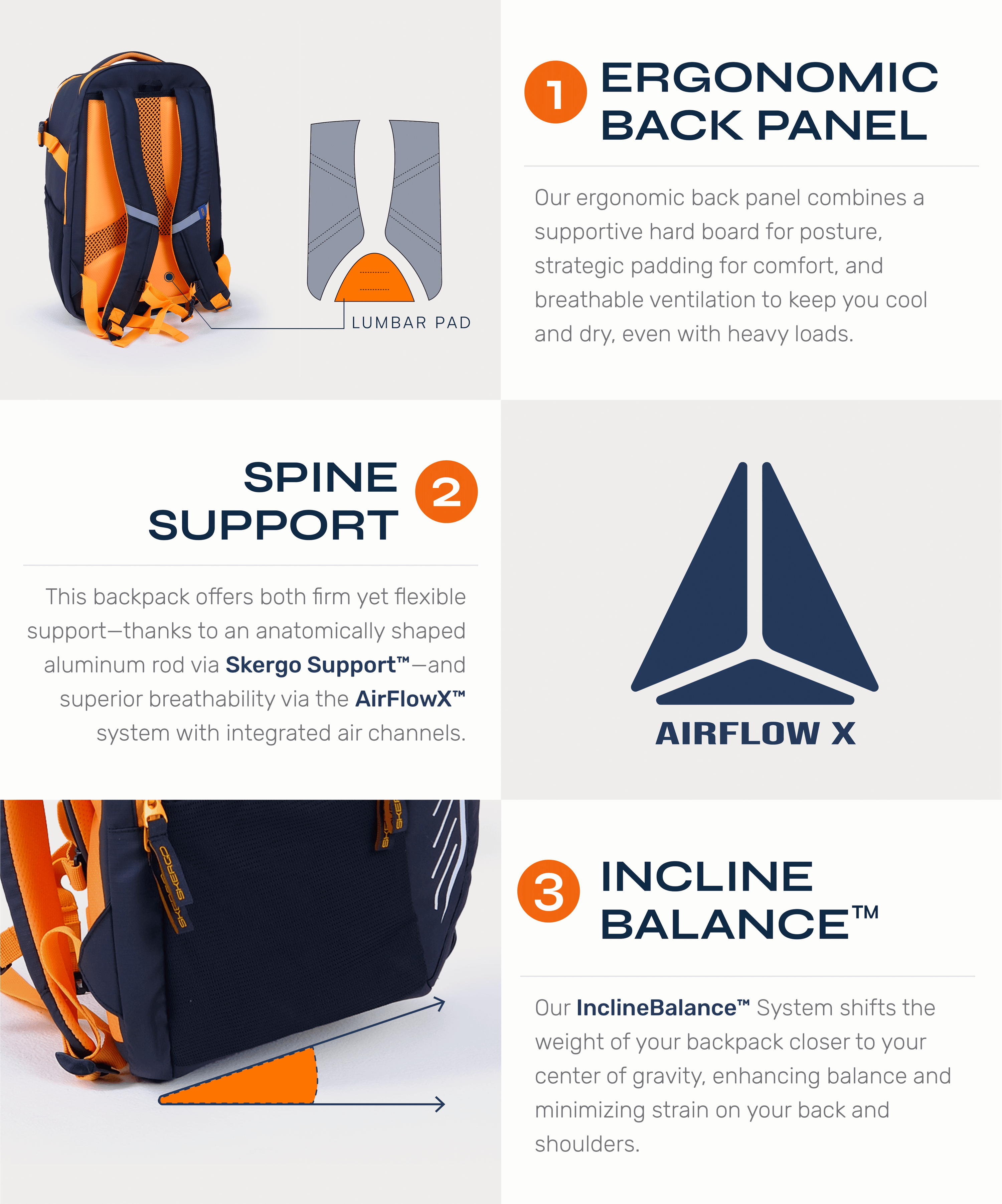 Skergo backpacks are designed with scientifically backed ergonomic features to support spine health and posture. Our Skergo Support™ and AirFlowX™ back panel technologies include an anatomically shaped aluminum rod, high-density EVA foam padding, and an inclined base to evenly distribute weight, reducing strain on the shoulders and spine.